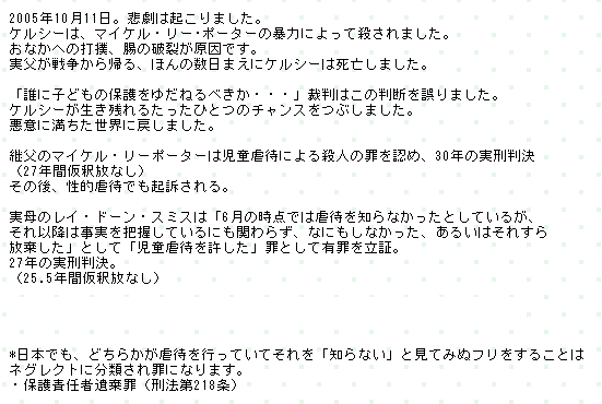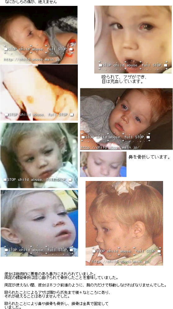 彼女に加えられた虐待は、たくさんのアザと両足骨折・鼻骨折・性的虐待etcetc....でした。
